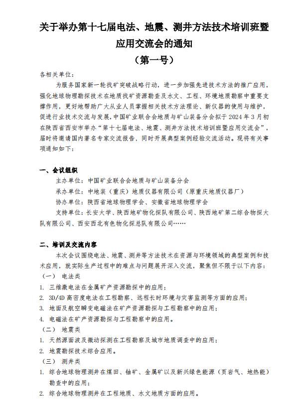 關(guān)于舉辦第十七屆電法、地震、測(cè)井方法技術(shù)培訓(xùn)班暨應(yīng)用交流會(huì)的通知(第一號(hào))